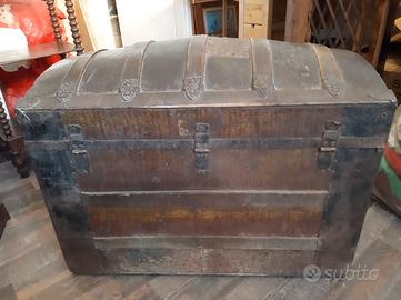 Raro baule Saratoga a dorso di cammello databile 1870 provenienza USA , in legno, metallo e cuoio con serratura originale. Esternamente perfetto, manca solo una maniglia in cuoio laterale facilmente sostituibile. Veniva usato dalle ricche famiglie statunitensi per andare all'ippodromo di Saratoga New York da cui prende il nome. Si trova a Mestre. Spedizione in Italia assicurata.
