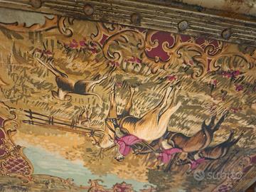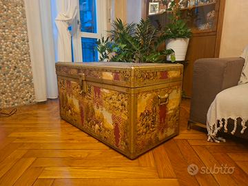 Baule antico da restaurare caratterizzato da un rivestimento con scene di caccia e dettagli in metallo. Misure 100 x 50 altezza 54