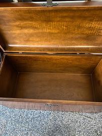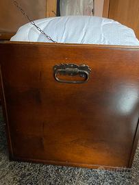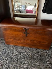 Vendo baule in legno massello, robusto e pesante, acquistato qualche anno fa e conservato molto bene. Il pezzo ha una struttura solida, ferramenta in metallo pieno e un coperchio curvo scolpito in un unico pezzo di legno. Questa curvatura armoniosa è una caratteristica rara, che lo rende unico nel suo genere. Qualche piccolo segno compatibile con l'età del pezzo, ma nessun difetto strutturale. Ideale come contenitore per biancheria, mobile d'ingresso o complemento d'arredo in stile rustico, country, vintage o shabby chic. Misure: L 104 x P 49 x H 57 cm.