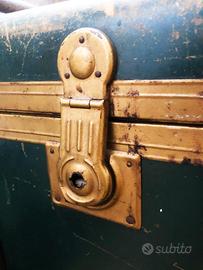 Vendo affascinante baule vintage da viaggio, risalente indicativamente agli anni '20-'30. Struttura robusta in legno rinforzato, rivestita in lamierino sottile verniciato di verde, con profili in metallo ottonato e angolari di protezione.