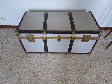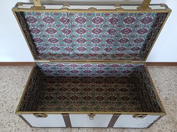Splendido baule vintage in stile retrò, pezzo decorativo e funzionale che cattura lo charme dei viaggi d'epoca. Struttura rigida e robusta con ricchi dettagli in metallo dorato e finiture a borchie che esaltano il suo carattere vintage. Perfetto come elemento d'arredo nel salotto, camera da letto, ingresso, oppure come pratico contenitore per biancheria, coperte, giocattoli, decorazioni o ricordi.