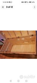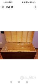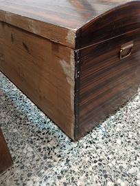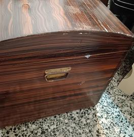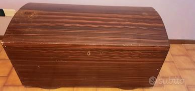 Cerchi un pezzo unico per dare carattere al tuo salotto o alla camera da letto? Proponiamo questo splendido baule d'epoca con coperchio bombato, caratterizzato da una rarissima e affascinante venatura orizzontale a contrasto che richiama lo stile esotico e déco. Design: Linea curva ed elegante, perfetto come fondo letto, tavolino da caffè o pezzo d'arredamento industriale/vintage. Dettagli: Maniglie laterali originali in metallo brunito e serratura frontale d'epoca. Interno: Legno chiaro naturale con rinforzi strutturali a vista, pulito e capiente. Condizioni: Il baule è solido e strutturalmente integro. Presenta segni del tempo sulla superficie (piccole sbeccature dell'impiallacciatura visibili in foto) che gli conferiscono un fascino autentico "vissuto". Un'ottima base per un restauro conservativo o un progetto di shabby chic moderno. Dimensioni: [Inserisci qui le misure in c Lunghezza 109 cm x Altezza 55 cm Profondità 55 cm