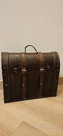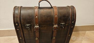Elegante baule in stile retrò, con dettagli in similpelle e finiture in metallo. Perfetto come complemento d’arredo, portaoggetti o elemento scenografico.