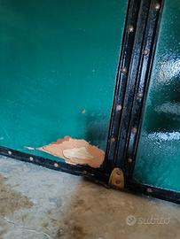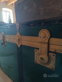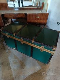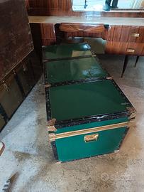 il modello presenta un rivestimento verde, bordato nero con rinforzi angolari in metallo dorato. 120x57cm h55 presenta un difetto sul retro in basso a sinistra come da foto