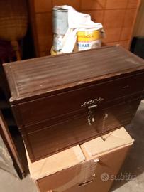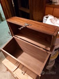 Bauletto antico da sistemare. Altezza totale: 34,5 cm. Altezza coperchio anteriore: 13,5 cm. Altezza coperchio posteriore: 9 cm. Lunghezza: 53 cm. Profondità: 23,5 cm. Si trova a Milano vicino a piazza Lima. Prezzo trattabile