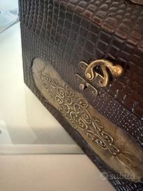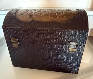 Bauletto/Scrigno decorativo in legno rivestito in similpelle marrone texture coccodrillo. Parte superiore con forma a cupola e inserto decorativo ribattuto con bassorilievo su lamina ottonata bronzata anticato sulla parte superiore e sul frontale inferiore. Fermaglio a gancio di chiusura nella parte anteriore in metallo anticato e maniglie laterali dello stesso materiale in metallo anticato. Interno rivestito in vellutino bordeaux. Dim largh 32cmxprof- 22cm. H max 27cm - Perfetto scrigno per contenere un regalo prezioso e d'impatto.