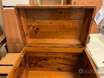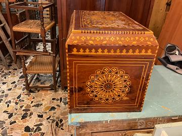 Bauletto intarsiato a motivi Moreschi con anche piccole madreperle in probabile Cedro dell’Atlante. L: 61. P: 40. H: 47 Visibile presso la nostra Bottega in via Zara 22 a Trento