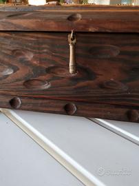 Bauletto vintage in legno massiccio intagliato a mano con bellissime caravelle dipinte in rilievo. Con maiglie in metallo.