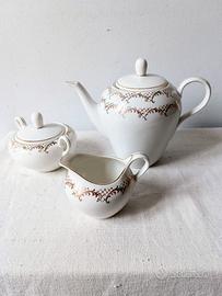 Caffettiera/teiera, zuccheriera e bricco del latte in porcellana bianca finissima, impreziosita da decorazioni in oro zecchino. Prodotti dalla manifattura Bavaria Fash intorno alla metà del XX secolo, molto apprezzati per l'eleganza dei decori classici e la resistenza del materiale.