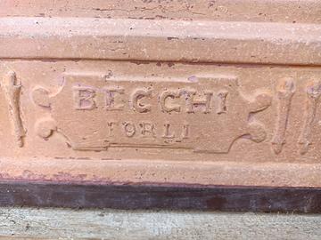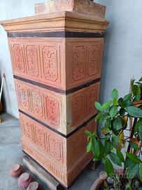 Stufa a legna in terracotta marca Becchi -Forlì, risalente ai primi anni del 900, funzionante, completa di canna fumaria in cotto con capitello e 4 piedi a “cipolla” sempre in cotto per l’appoggio al suolo. La stufa ha due sportelli, uno basso per la legna e uno alto per scalda vivande. Nel tempo alcuni punti sono stati sistemati con impasto di refrattaria. Dimensioni del corpo stufa (senza piedi e canna fumaria) sono cm 38 x 100 x 54.