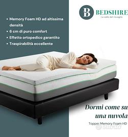Bedshire Double Mattress Topper 160 x 190 cm HD Memory Foam Corrector Mattress 6 cm High with Removable Cover Orthopaedic Futon Made in Italy 100%