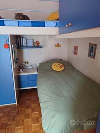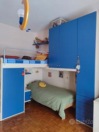 Cameretta angolare in ottime condizioni. Misure: lunghezza (letto superiore + scaletta) 246 cm; profondità (letto inferiore + colonna armadio) 256 cm; profondità scaletta 132 cm; altezza max 259 cm.