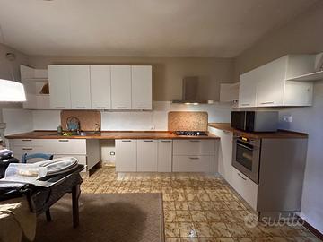 Cucina disegnata con cura da un designer. Sopra tutto legno massiccio. Con piano cottura e cappa Frankie, 4 cassetti, 2 sotto lavello con uno x le immondizie differenziata, 3 armadi sopra, uno grande sotto la dispensa x le spezie che si tira fuori, 2 grandi cassette sotto piani cottura, 3 mensole grandi da angolo, un cassetto X i piatti cottura forno, Tutto ripiano legno massiccio. Poi mensole aperte per piatti e decorazioni. Bianca e écru! Ripiani di marmi dietro zone di lavaggio e cottura. Spese di smontaggio e trasporto a carico dell’acquirente ma ho già il trasportatore che è un esperto di cucine. Usato ma con condizioni perfette.