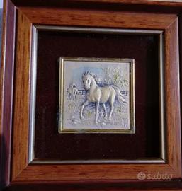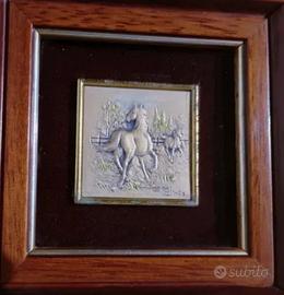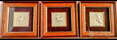 Bellissima serie di 3 cavalli incisi su lastre d'argento 923 % già inseriti in cornici di legno.