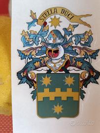Stemma adesivo Stella Duci con predominanza di colore verde, specifico per bilance d'epoca Berkel di colore bianco, oro ed avorio. Il logo Stella Duci con predominanza azzurro è invece storicamente presente su bilance Berkel di colore rosso e nero. Sono compresi due stemmi Stella Duci e quattro scritte corsivo Berkel da 7 cm in similoro, pretagliati. Spedizione Posta1 compresa nel prezzo.