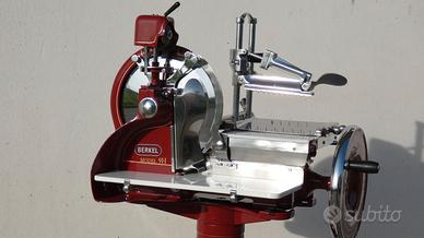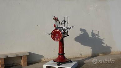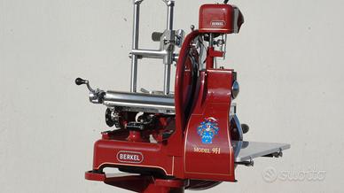 Affettatrice a volano della prestigiosa Berkel , in tutto il mondo è riconosciuta come la migliore , linee senza tempo , scorrevolezza eccezionale , taglio sempre perfetto, in produzione dal 1936, questa in particolare è stata riportata all'antico splendore , può essere da appoggio su tavolo o completa di piedistallo, annuncio reale , macchina di mia proprietà.