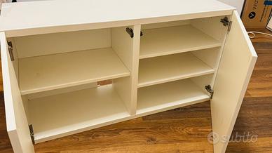 Mobile besta ikea, pezzo unico 120x60x64 Usato ma in buono stato, con passacavi per tv o altro. Ripiano in vetro. Segni di usura visibili in foto.