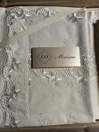 Stile: Il set presenta un design raffinato e classico, con ricami complessi e bordi smerlati che suggeriscono un prodotto di lusso o per corredo.