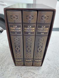 Bibbia in tre volumi con rilegazione d'orata. Ottima aggiunta per una biblioteca personale.