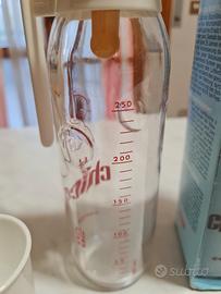 Biberon della Chicco in vetro termoresistente da 250 ml completo di bicchierino. Il biberon è originale, non è mai stato utilizzato e rimasto sempre nella sua confezione originaria in quanto una rimanenza. Vendo per inutilizzo.