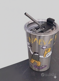 Bicchiere in acciaio inossidabile con coperchio trasparente e cannuccia in metallo. Presenta una simpatica stampa grafica.