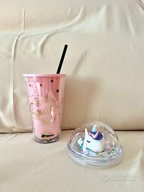 Bicchiere doppia parete color rosa con coperchio trasparente decorato da un unicorno 3D e brillantini mobili.