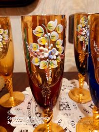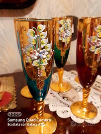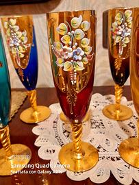 Meravigliosi Bicchieri di Vetro di Murano colorati e ricoperti di Oro Zecchino e Fiori. Sono ideali in Vassoio ed il Vetrina. Si adattano anche nello stile Moderno. Perfetti e senza difetti