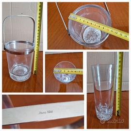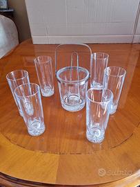 Set composto da sei bicchieri alti da bibita e secchiello per il ghiaccio con pinza. I bicchieri e il secchiello hanno il fondo spesso e lavorato. Vetro robusto. Il secchiello ha il bordo e il manico in acciaio inox 18/8. Pinza in acciaio. Anni settanta. Vintage. Mai usato. Non hanno difetti. Bicchieri alti cm 15, diametro cm 6. Cestello alto cm 13 più il manico, diametro cm 10,5.