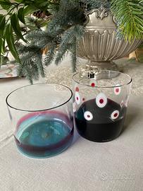 Bicchieri individuali h. cm. 10,2 , diametro 9,4 , da collezione in Cristallo di Murano trasparente a sezione irregolare, soffiatura a bocca , taglio manuale artistico ... come se li avesse sospinti un vento di bora ... 2 differenti varianti , meravigliosa quanto unica esecuzione artigianale italiana firmata Carlo Moretti . - il costo indicato è per ogni bicchiere
