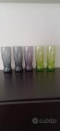 Set di cinque bicchieri Coca-Cola, in vetro. Due bicchieri sono di colore giallo, due grigi e uno viola. Sono in ottime condizioni, perfetti per collezionisti o per aggiungere un tocco retrò alla tua cucina.