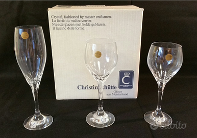 Bicchieri in cristallo di pregiata manifattura tedesca Christinenhutte, servizio completo da 12 pezzi ciascuno, acqua, vino e flute. Non vendo singoli pezzi. NO spedizione