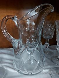 Elegante e raro servizio in cristallo molato per12 persone composto da 5 forme diverse di bicchieri con stelo taglio diamante più 2 brocche e 2 bottiglie con tappo per un totale di 64 pezzi. Ottime condizioni , praticamente perfetti.