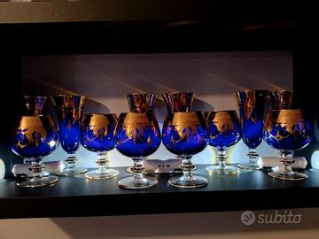 Set da 6 bicchieri, calici/flute in cristallo veneziano, blu cobalto con decorazioni Oro 24 K dipinti a mano.