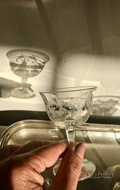Splendidi bicchieri di Murano , prima metà del 900 , decorazione dame e cavalieri . Sono 6 coppe da champagne e 5 bicchierini da liquore . Hanno ancora tutti i loro bollini , sono in perfetto stato e sono meravigliosi .