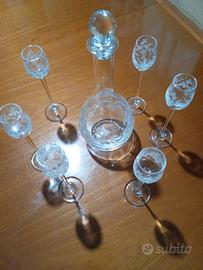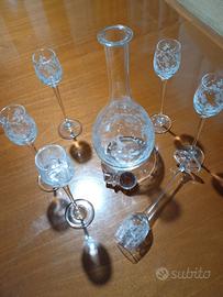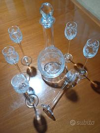Servizio di 6 bicchieri con bottiglia per liquori, in cristallo di altissima qualità, con decorazioni floreali. Dimensioni bicchieri: altezza 14cm ; diametro 2,5; bottiglia altezza 23 cm. Alla base dei bicchieri e della bottiglia è ben chiara l' incisione molar cristallo che indica decorazioni a mano, periodo fine 1900.