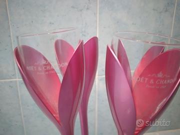 Set di 4 bicchieri da champagne con stelo rosa fluo e con base in acrilico trasparente.