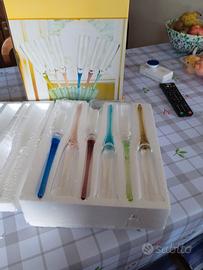 Sei bicchieri flute in vetro colorato con base d'appoggio, mai usato, con scatola originale