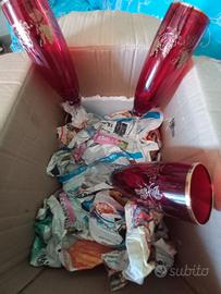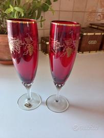 servizio di 12 bicchieri in cristallo di Boemia, colore rosso rubino con decori grappoli uva oro zecchino , nuovi, vendibili anche separati cioè 6