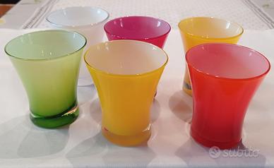Bicchieri in vetro di Murano incamiciati anni 80. Sono tutti colori diversi tranne il giallo che sono 2, rosso scuro, bianco, arancio e verde.