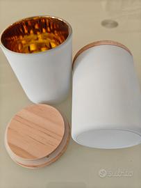 Disponibile per l' acquisto in lotto unico, bicchieri per realizzazione candele con tappo in legno molto raffinato.