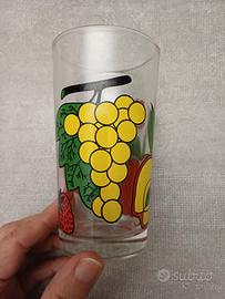 Bicchieri n. 6 (diametro 6 cm circa - altezza 12 cm circa) + caraffa con manico (diametro 9 cm circa - altezza 20 cm circa) - in vetro - trasparenti con decori frutta. Da lavare, in quanto riposti da tempo: presenza di calcare. Ottime condizioni