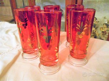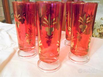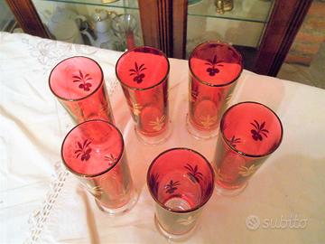 Set da 6 Caratteristici bicchieri in vetro rosso con gambo corto decorati in oro anni 60/70 altezza bicchiere cm 15 diametro cm 6