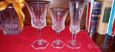 Per fare spazio nella vetrina, vendo, 18 bicchieri vecchi in cristallo, fatti in un pezzo solo, spumante, vino, acqua, mai usati, solo per bellezza, e pesano: 416 gr acqua, 294 vino e 268 spumante, cedo 7 euro l'uno, 126 tutti (trattabili) negli altri annunci ho anche dei bicchieri da Whisky.