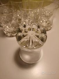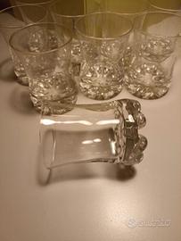 Bicchieri in vetro con fondo spesso lavorato. Per acqua o cocktail. Vintage anni '60-'70. Servizio composto da 9 pezzi. I bicchieri hanno la particolarità di essere impilabili fondo-con-fondo.