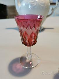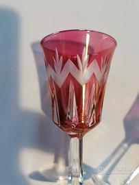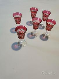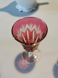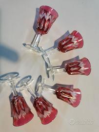 n° 6 pregiati bicchieri da liquore vintage autentici ,lavorazione molto pregiata ,colore bordeaux. Mai adoperati , condizioni ottime ,solo uno presenta una quasi impercettibile sbeccatura sul bordo ,ma praticamente invisibile a occhio nudo , Per quanto riguarda il materiale non sono in grado di affermare con assoluta certezza se si tratta di cristallo o vetro antico