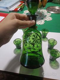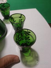 Set di cinque bicchierini con bottiglia in vetro verde di Murano con dettagli neri.