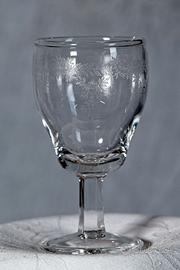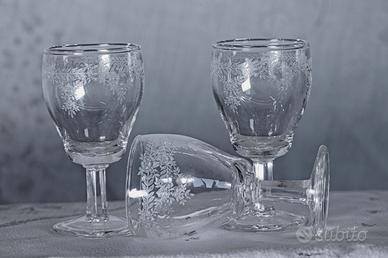 Set di 6 bicchierini in vetro trasparente, finemente decorati con motivo decorativo di ghirlande floreali e rose stilizzate che cingono la parte superiore di ogni coppa. La tecnica di serigrafia/incisione è tipico del periodo Liberty o Edoardiano, prodotte da manifatture come Baccarat (Francia) o la Cristalleria Val d'Elsa (Italia).