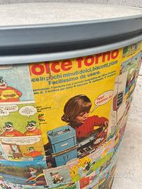 Stupenda coppia di bauli contenitori in cartone pressato con coperchio a chiusura scatto provenienti da box per mobili di design,rivisitati in chiave Disney con decoupage di fumetti topolino vintage e pubblicità di giochi d’epoca che erano presenti nel fumetto.