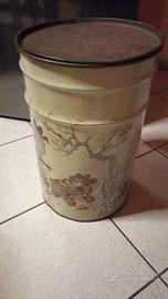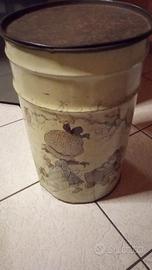 Bidone in latta con coperchio, raffigurante Holly Hobbie. Presenta un po' di ruggine ma nulla che possa comprometterne l'uso. Diametro: 21cm. Altezza: 46cm