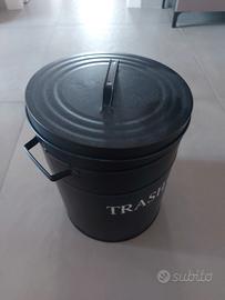 Bidone nero in metallo con coperchio.